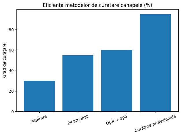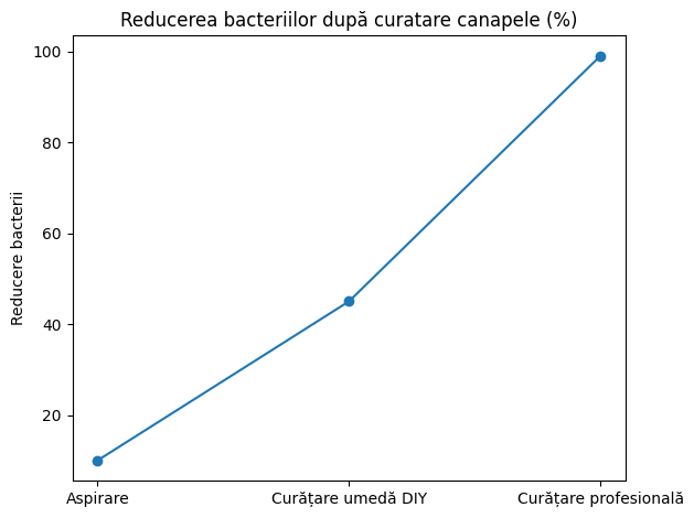 Metodele de acasă pot elimina până la 60% din murdărie, însă doar curățarea profesională reduce bacteriile în proporție de până la 99%.